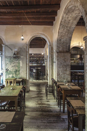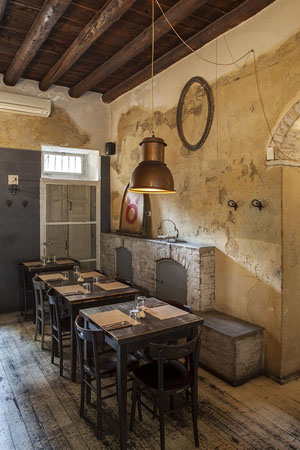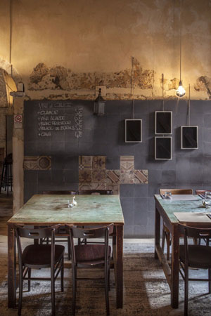Il ristorante è composto da varie salette, molto caratteristiche, disposte su un unico piano. Uno stile particolarissimo con tavoli in legno stile antico, e pareti rustiche con archi divisori e travi a vista. Ajoblanco propone ogni giorno un aperitivo diverso, e per la cena menù personalizzati per gruppi più grandi di sei persone.