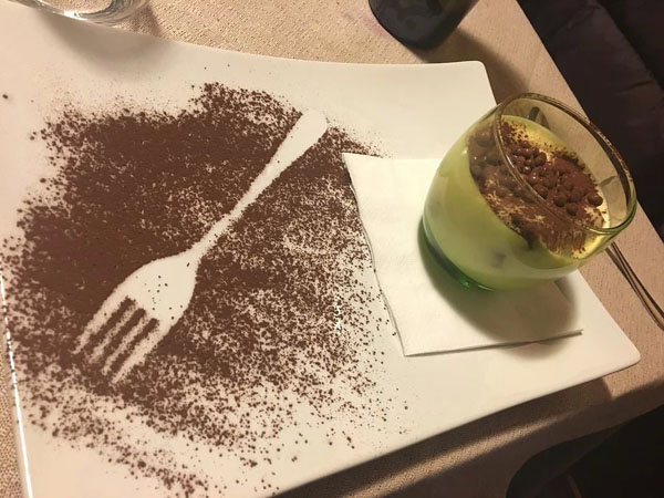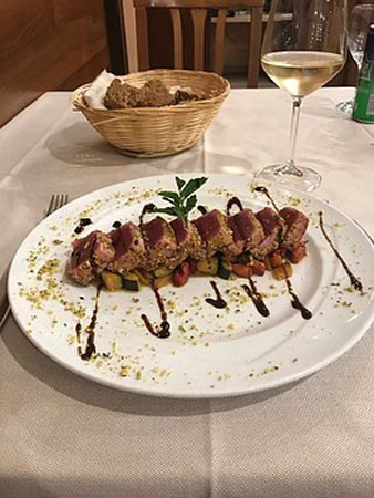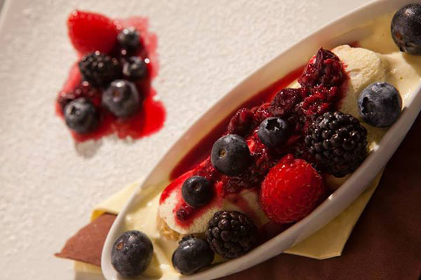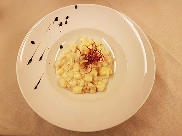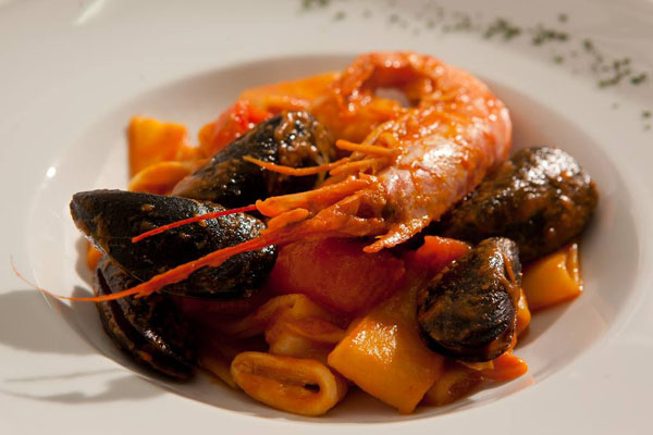 Solo per citare alcuni piatti, si pensi alla “sfera di filetto di manzo con pomodoro cuore di bue, mozzarella di bufala e olio extravergine d’oliva” tra gli antipasti; al “risotto con pesto di zucchine, cozze, tartufi di mare e fiori di rosmarino selvatico” nella carta dei primi piatti; ai “filetti di sogliola dorati alle mandorle con salsa calda di limone e fiori di cappero” o alla “tagliata di manzo all’aglio e rosmarino con radicchio trevisano brasato” per i secondi … e per concludere la vostra cena i meravigliosi dessert della casa, belli da vedere e buoni da gustare!