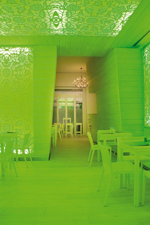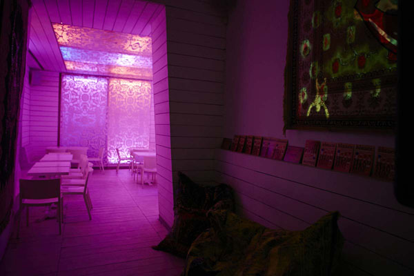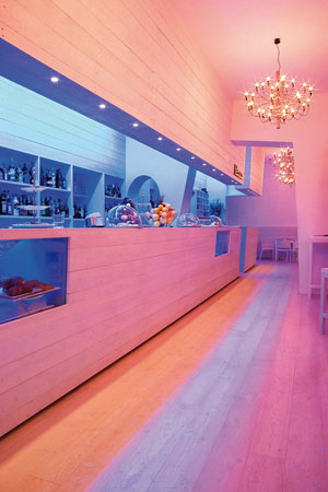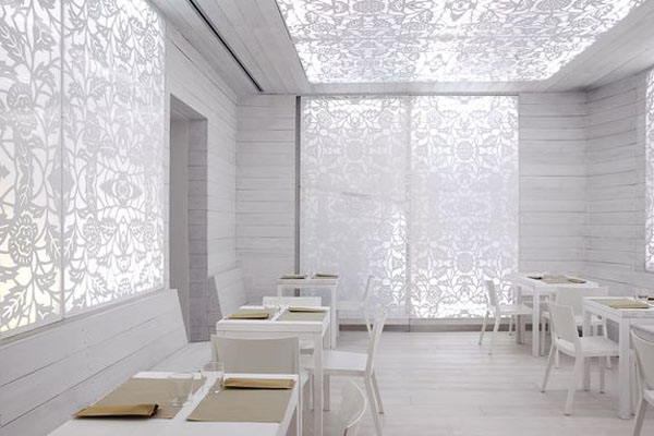 Composto da sala unica a forma di elle, il bianco è il colore che caratterizza l’intera location! Bianco che naturalmente si colora di mille varianti a seconda dell’illuminazione. Già da questo si intuisce un’atmosfera piuttosto particolare, con un locale completato da tavoli e sedie in legno, anch’essi bianchi, sia in interno che in esterno.