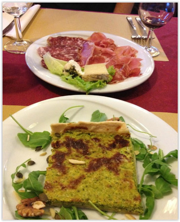 Tra gli antipasti la specialità è rappresentata dallo gnocco fritto, soffice e gustoso accompagnamento per il tagliere di salumi. I primi piatti, a base di pasta fresca fatta in casa, vedono protagonisti i tortelli di spinaci e ricotta, i tortelli di patate al soffritto rosso, i tortelli di porri e ricotta e i tronchetti di crèpes. I secondi piatti sono a base di carne, con arrosto di maiale o tagliata di manzo, a cui si affiancano melanzane alla parmigiana, bresaola e grana o un mix di formaggi.