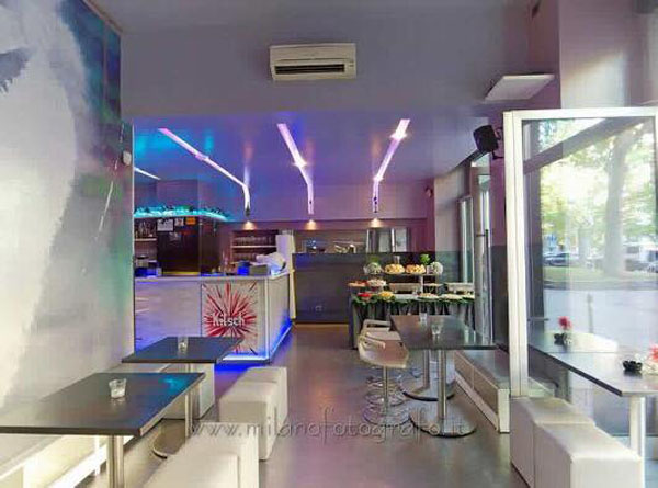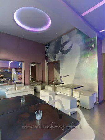 Una sala unica, suddivisa in due parti spaziose: zona drink con ampio bancone e zona tavoli, con divanetti e pouf in stile moderno e pelle bianca! Come anticipato, le tonalità predominanti della location sono il rosa (ovunque!) e il bianco. Il tutto impreziosito dalla presenza di lampadari piuttosto psichedelici, che rendono l’ambiente ancora più fashion!