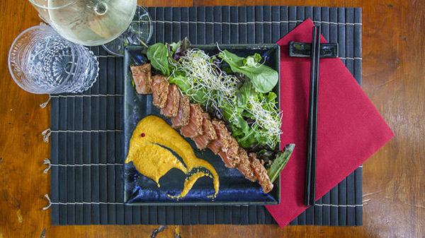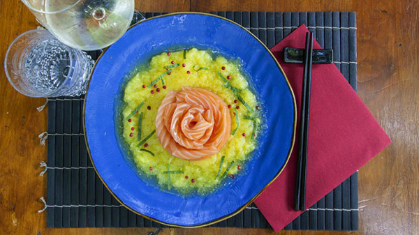 Per gli amanti del pesce crudo, si può scegliere il sashimi di salmone in semi di coriandolo e pepe rosa, foglie d’insalata e salsa wasabi, o il sushi vietnamita ripieno di verdure e salmone con erbe fresche e salsa piccante allo zenzero.