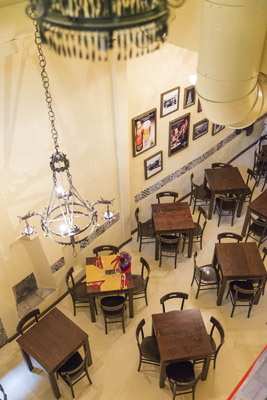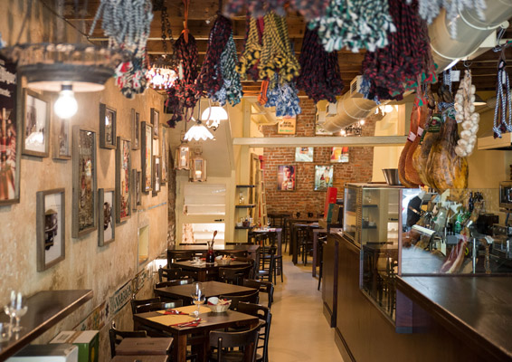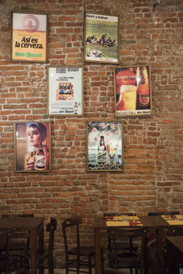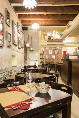 L’ambiente del ristorante è volutamente rustico: in una sala lunga e stretta spicca il grande bancone in legno che introduce alla zona tavoli, dove sembra di venire catapultati nel clima di una autentica cantina spagnola.